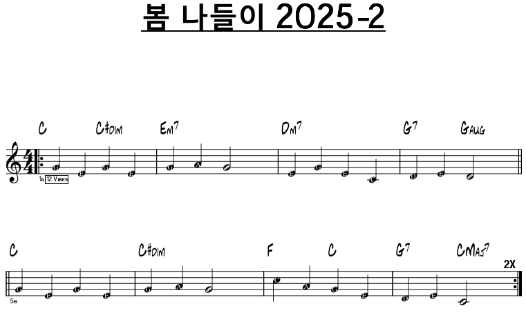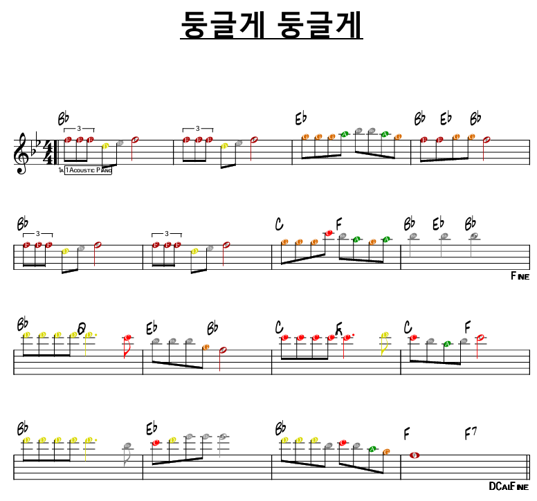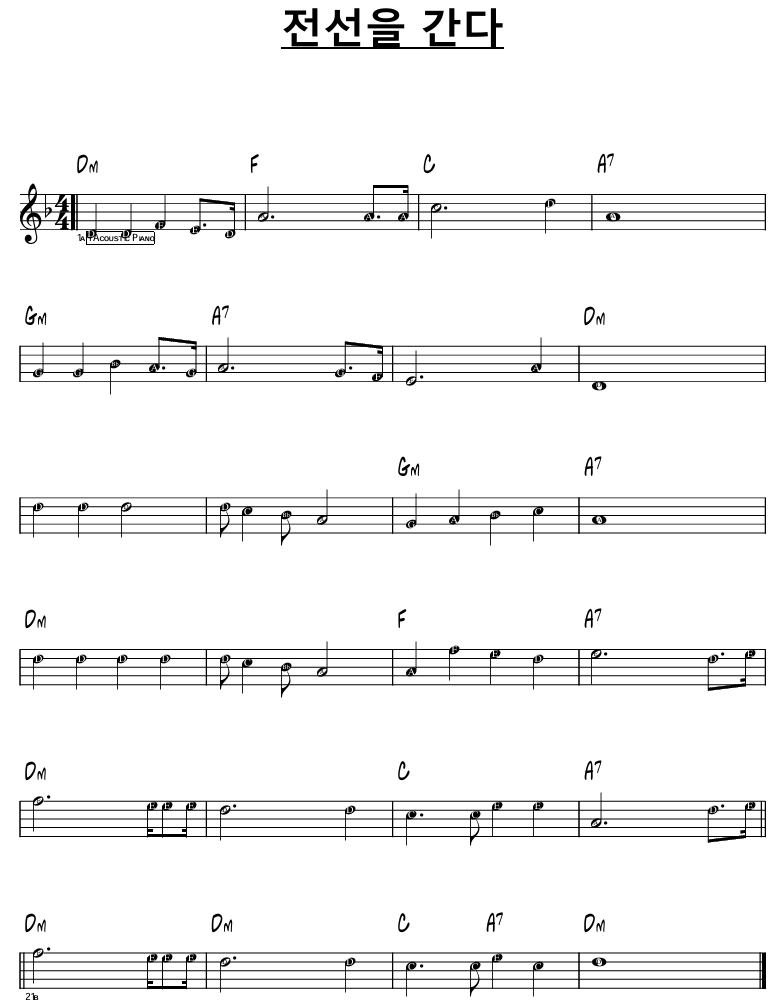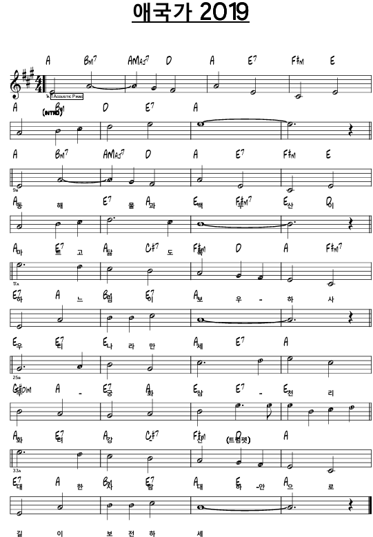 애국가 2019 악보: 다른 코드: 참고: 아래 YouTube 영상 코드를 참고한 것이다. (도움 받은 프로그램: 안드로이드 앱 Chord ai) 옛날 버전에 비해 텐션 코드가 추가되었다. Music 2025.02.04